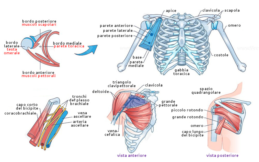 Ha quattro pareti, un apice verso il processo coracoideo e una base esterna, collegato al canale cervico-ascellare per il passaggio di vasi succlavi e nervi del plesso brachiale. Contiene linfonodi ascellari per il drenaggio linfatico e strutture vascolari essenziali per l'irrorazione dell'arto superiore.