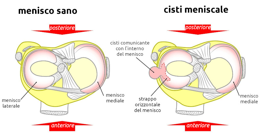 - Descrizione: Lesione cistica collocata ai bordi esterni del Menisco, spesso associata a lesioni orizzontali del menisco. Dolore al ginocchio e gonfiore o una massa palpabile a livello del Ginocchio, sono i sintomi più comuni. La cisti può avere consistenza variabile.