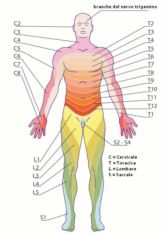 I dermatomeri sono regioni cutanee specifiche innervate da un singolo nervo spinale, derivanti dalla radice posteriore sensitiva. Queste aree della pelle non si sovrappongono significativamente e permettono di mappare l'innervazione sensoriale del corpo umano. Ogni dermatomero corrisponde a una porzione di cute collegata a un neuromero spinale, originandosi dall'ectoderma embrionale e fornita da un ganglio della radice dorsale. Servono per testare la sensibilità cutanea e diagnosticare lesioni nervose, come in esami neurologici.