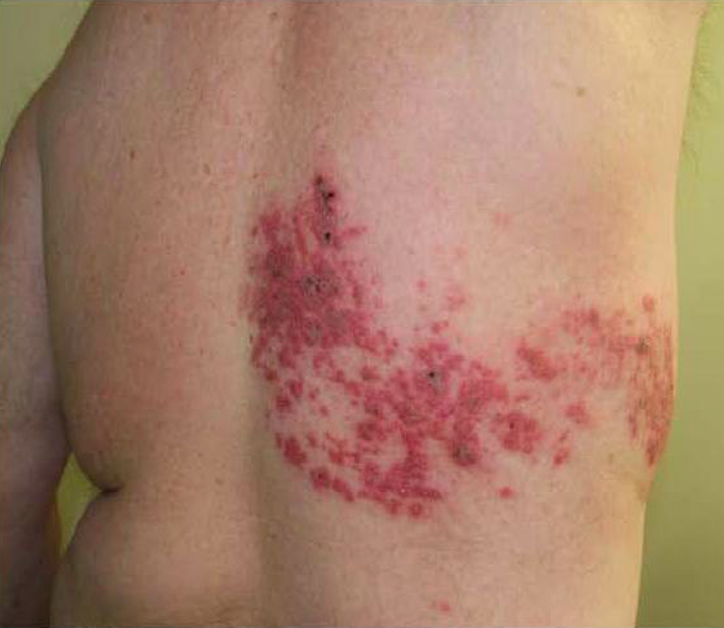 - Descrizione: Infezione per riattivazione del Virus della varicella zoster che produce bolle sulla Pelle in forma di grappolo. Colpisce tanto il Derma come l'epidermide e può manifestarsi sulla Schiena, sulla Nuca, sulle Natiche, sul Volto, sul cuoio capelluto o sulla Cornea.