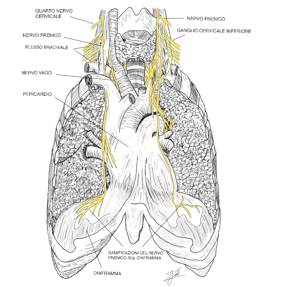 - Descrizione: Il nervo frenico è il principale nervo che controlla il Diaframma, quindi è uno snodo chiave tra Respirazione, postura, Cuore e vissuto emotivo legato al “respiro della vita”.