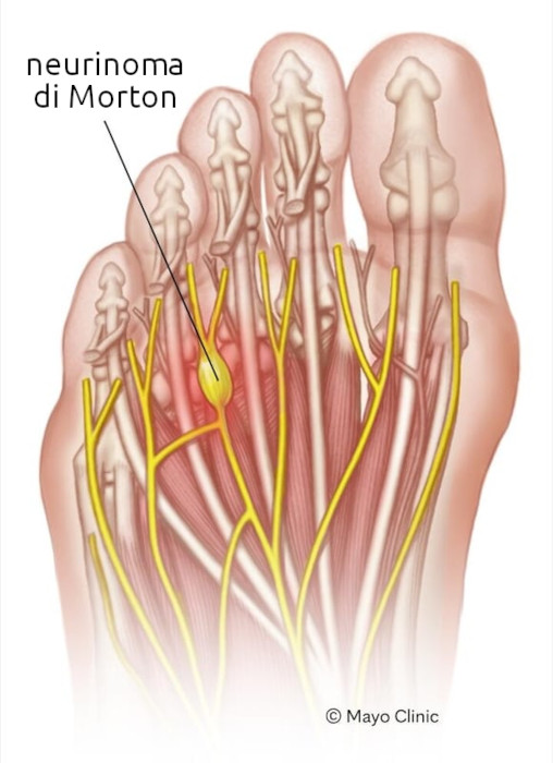 - Descrizione: Tipo di fibrosi peri-nervosa con aumento di volume di un Nervo sensitivo interdigitale, solitamente quello passante nel terzo spazio tra i metatarsi. Avviene la crescita di tessuto cicatriziale fibroso intorno al nervo stesso, subito prima della sua biforcazione alla radice delle dita. Il Dolore è molto forte, spesso con scosse elettriche e bruciori. Camminando il dolore è amplificato, ma può essere avvertito anche a riposo. Talvolta parestesie, intorpidimento e calo della sensibilità dei metatarsi.
