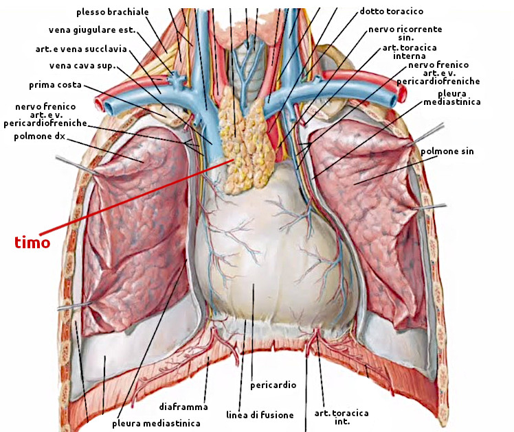 - Descrizione: Organo ghiandolare endocrino a intensa attività durante l'infanzia e la crescita. Situato nella parte inferiore del Collo, sopra il Mediastino anteriore. È la ghiandola principale del Sistema immunitario e la sua funzione è quella dello sviluppo e maturazione di linfociti T.