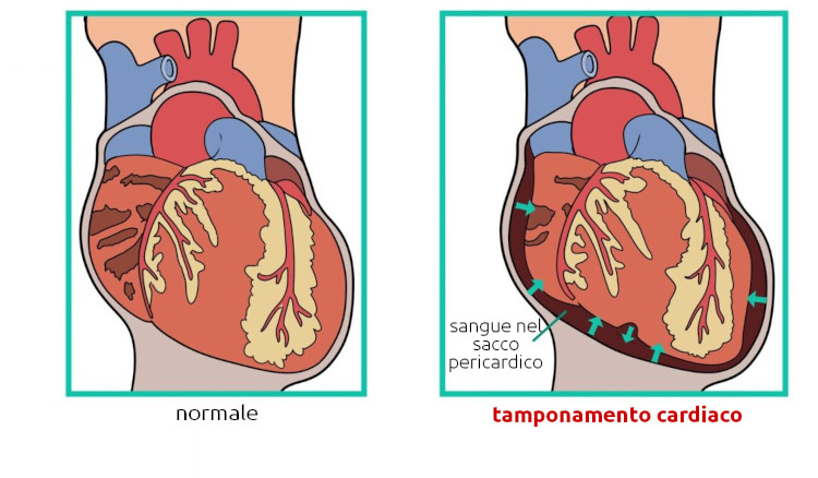 - Descrizione: Condizione grave in cui si accumula liquido o Sangue nel sacco pericardico, la membrana che avvolge il Cuore, generando una pressione tale da comprimerlo e compromettere il suo normale riempimento e funzionamento. Questo mancato riempimento impedisce al cuore di pompare efficacemente il sangue al corpo, causando ipotensione, toni cardiaci ovattati e distensione delle vene del collo, sintomi che costituiscono la triade di Beck. Può derivare da traumi, perforazioni del pericardio, emorragie, infezioni o infiammazioni.