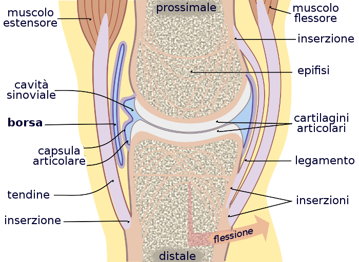 - Descrizione: Infiammazione della borsa articolare. La borsa è una struttura a forma di sacca situata tra le ossa, i tendini e i muscoli, che facilita il movimento.