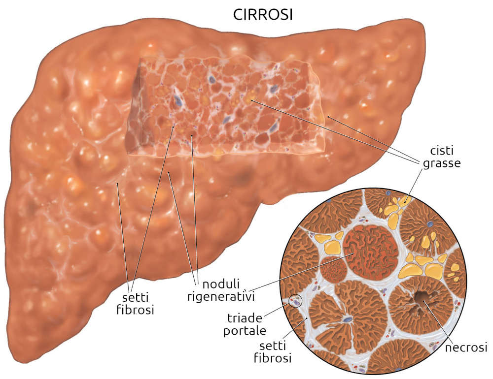 - Descrizione: Istopatologia che è il risultato di multipli processi infiammatori del tessuto del Fegato, in cui le cellule epatiche morte vengono sostituite con altre fibrose.
