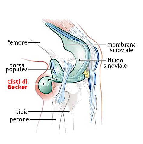 - Descrizione: Detta anche cisti poplitea, è una sacca piena di liquido sinoviale che si forma nella parte posteriore del Ginocchio, nella cosiddetta fossa poplitea. È una dilatazione/erniazione della capsula articolare o di una borsa sinoviale dovuta a eccesso di liquido prodotto dall’Articolazione del ginocchio. Può essere idiopatica (senza patologia articolare evidente) oppure secondaria a patologie del ginocchio negli adulti.