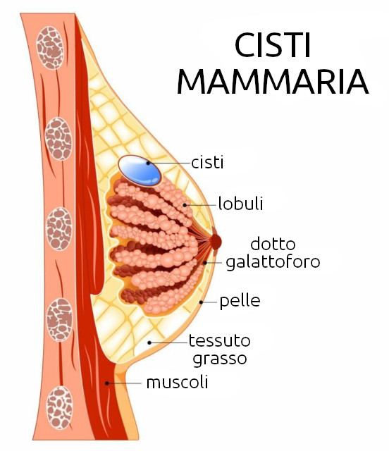 - Descrizione: Cavità piena di liquido che si forma nei lobuli o nei dotti galattofori della Mammella, spesso asintomatica. È frequente nelle donne in età fertile e può dare dolore o tensione se aumenta rapidamente di volume. Ha contorni netti, consistenza liscia e generalmente mobile alla palpazione, e può essere singola o multipla, di dimensioni da pochi millimetri a diversi centimetri.