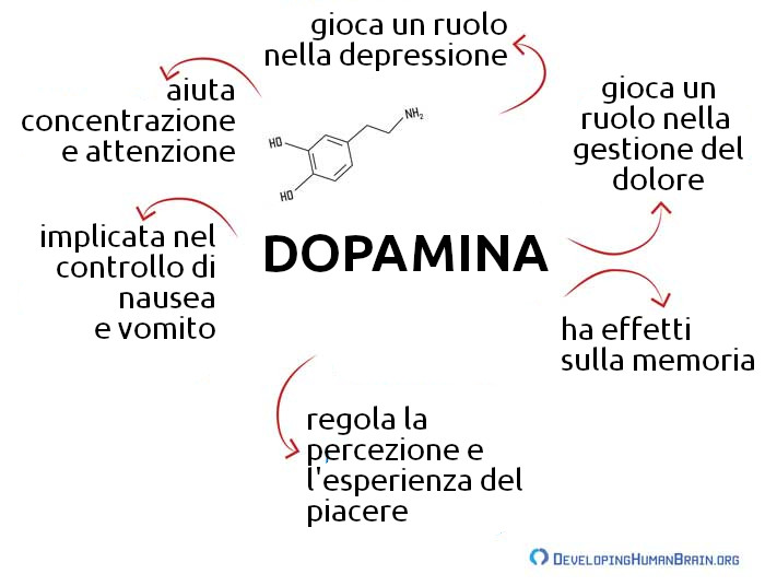 La dopamina è prodotta in diverse aree del cervello, tra cui la substantia nigra e la area tegmentale ventrale (VTA). Grandi quantità si trovano nei gangli della base, soprattutto nel telencefalo, nell'accumbens, nel tubercolo olfattorio, nel nucleo centrale dell'amigdala, nell'eminenza mediana e in alcune zone della corteccia frontale. Nessun altro sistema neuronale ha ricevuto tanta attenzione negli ultimi 20 anni quanto quello dopaminergico. La dopamina è anche un neuro ormone rilasciato dall'Ipotalamo. La sua principale funzione come ormone è quella di inibire il rilascio di prolattina da parte del lobo anteriore dell'Ipofisi. A livello gastrointestinale il suo effetto principale è il vomitare. La dopamina può essere fornita come un farmaco che agisce sul Sistema Ortosimpatico, producendo effetti come aumento della frequenza cardiaca e della pressione sanguigna.