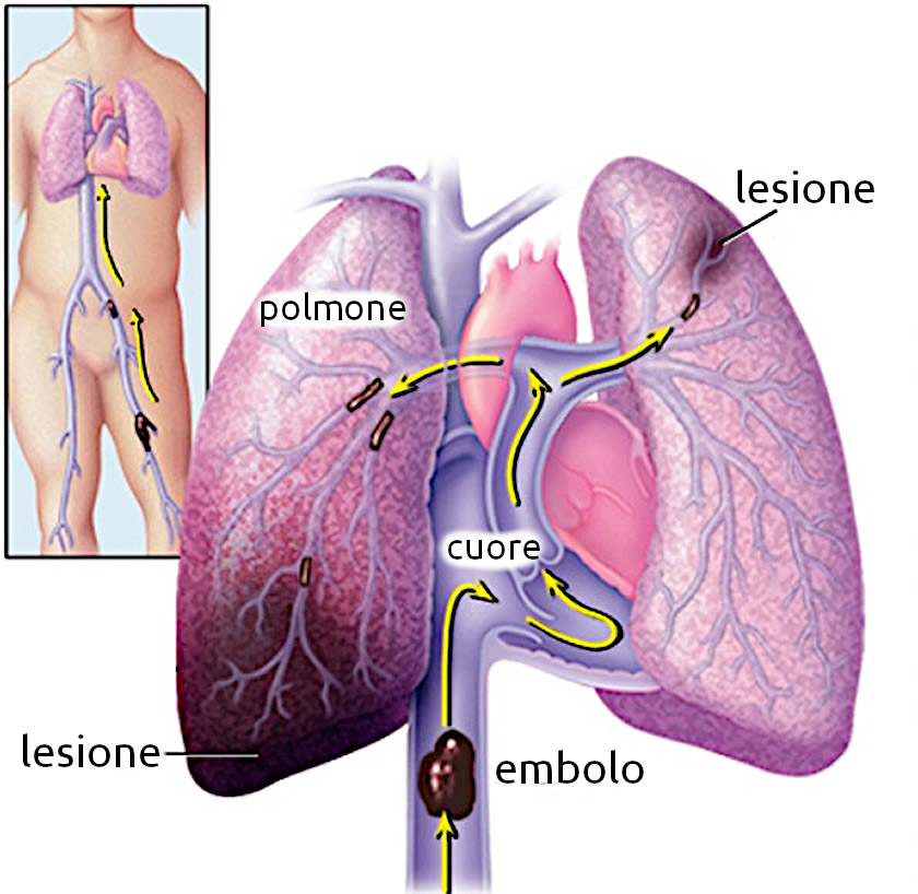 - Descrizione: Blocco di una arteria polmonare. La causa può essere una Trombosi venosa che si distacca e viaggia fino al Polmone.