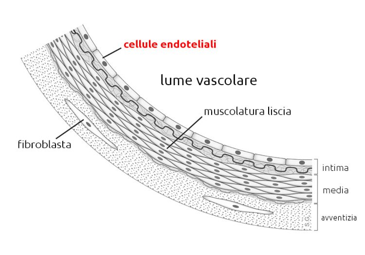 L'endotelio consiste in cellule endoteliali appiattite, poligonali e allungate, disposte in un unico strato su una membrana basale sottile. Il nucleo è ovoidale, il citoplasma contiene organelli come mitocondri, reticolo endoplasmatico, vescicole e corpi di Weibel-Palade; il citoscheletro include filamenti per la stabilità strutturale e adesioni focali con integrine. Le cellule sono polarizzate, con superficie luminale (verso il sangue) ricca di glicocalice e superficie basale aderente alla lamina basale; si collegano tramite giunzioni strette e spazi intercellulari di 15-20 nm.