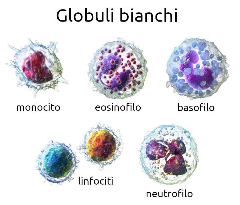 - Descrizione: Cellule sanguigne chiamate anche leucociti che intervengono nella difesa dell'organismo contro sostanze estranee o agenti infettivi. Hanno la loro origine nel Midollo osseo e nel tessuto linfatico.