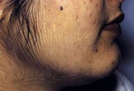 - Descrizione: Disposizione maschile della peluria nella donna. Si collega spesso al morbo di Cushing. Questo rappresenta una alterazione funzionale delle surrenali.