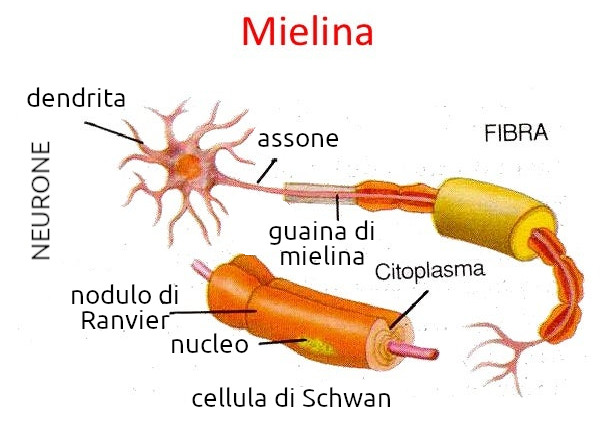 - Descrizione: La mielina è una sostanza lipidica e proteica che riveste le fibre nervose del Sistema nervoso centrale e periferico, formando una guaina chiamata guaina mielinica. Questa guaina è prodotta da cellule specializzate, gli oligodendrociti nel sistema nervoso centrale e le cellule di Schwann nel sistema nervoso periferico. La sua funzione principale è quella di isolare elettricamente gli assoni neuronali, consentendo la trasmissione rapida ed efficiente degli impulsi nervosi mediante un meccanismo chiamato conduzione saltatoria, che fa "saltare" l'impulso da un nodo di Ranvier all'altro, aumentando la velocità di trasmissione fino a 150 m/s.
