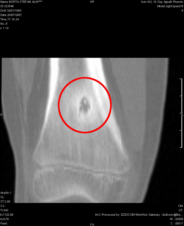- Descrizione: Piccolo Tumore benigno che compare nell'Osso spongioso, principalmente in Gambe, Braccia e vertebre. È doloroso.