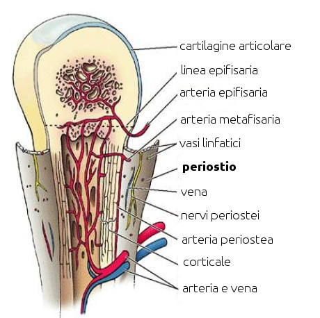 - Descrizione: Si tratta della membrana che avvolge l'Osso. Dal periostio giungono all'osso vasi sanguigni, nervi, vasi linfatici che ne garantiscono la vita e lo sviluppo. Il periostio entra in gioco sia nel momento dell'Osteolisi che in quello di ricostruzione ossea.