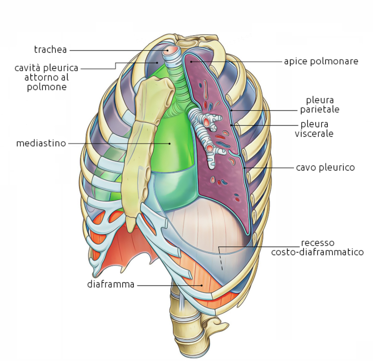 - Descrizione: Membrana sierosa che ricopre e protegge i Polmoni. Si divide in pleura parietale (esterna) e pleura viscerale (interna).
