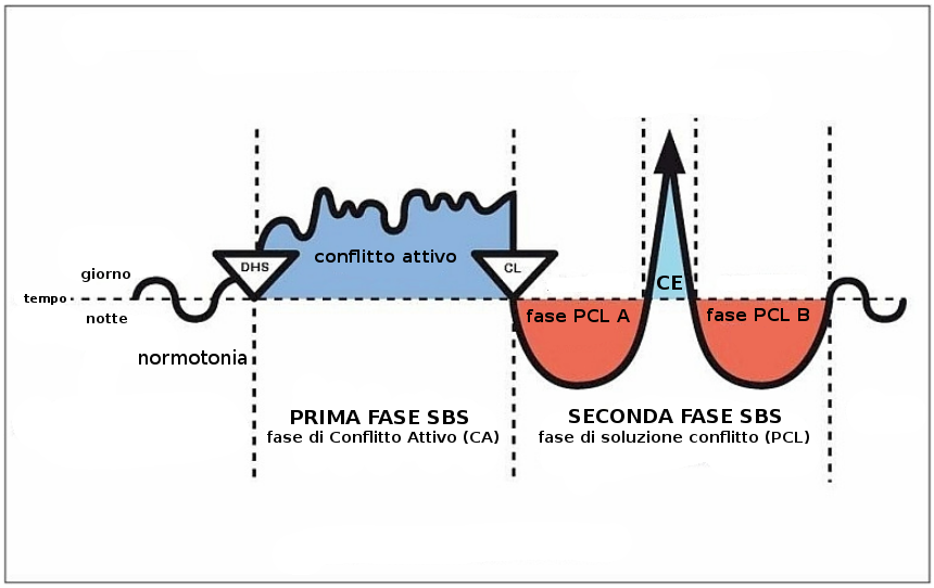 Con la comparsa della DHS descritta alla Prima Legge Biologica, l'organismo entra in fase permanente di Simpaticotonia o stress continuo, che è la fase fredda dell'attivazione o di stress simpaticotonico. Quando avviene la soluzione del attivazione si avvia una vagotonia permanente. La vagotonia è una fase di recupero e riposo continuo, la fase calda della malattia, che sarà interrotta nel suo punto più profondo, dalla Crisi Epilettoide, punto simpaticotonico che caratterizza il brusco cambio della fase vagotonica, con una forte spinta a urinare che consente la eliminazione di gran parte dei liquidi trattenuti. L'SBS si conclude con il ritorno alla normalità o normotonia.