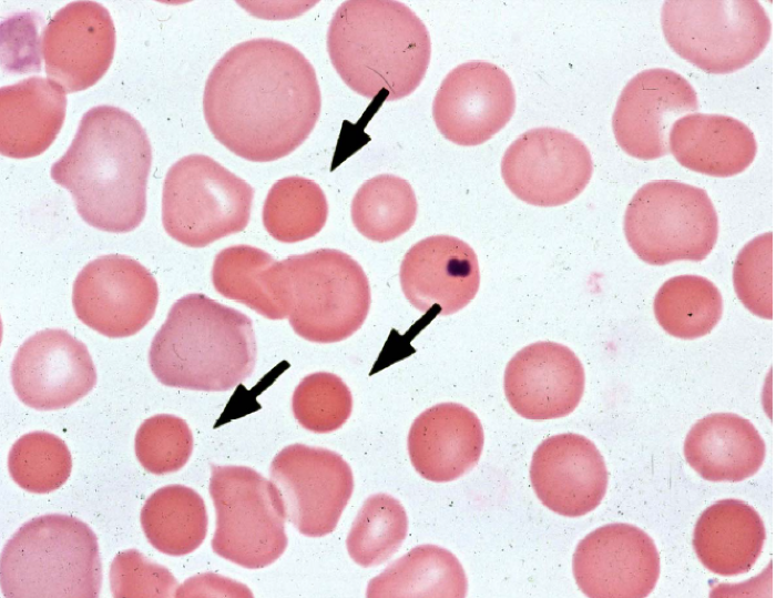 - Descrizione: Malattia del Sangue in cui la forma dei Globuli rossi, dalla caratteristica forma a disco biconcavo, diventa sferica (sferociti). Questi si reperiscono nella malattia di Minkowski-Chauffard e in alcune anemie. Sebbene gli sferociti possiedano un'area superficiale inferiore a quella degli eritrociti normali, essi svolgono comunque adeguatamente il loro ruolo, ma risultano più fragili.