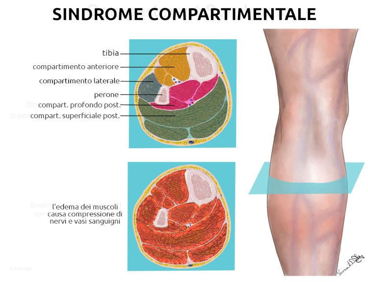 - Descrizione: Incremento della pressione tissutale all'interno di uno spazio fasciale chiuso che provoca una mancata perfusione tissutale. Tutto inizia con un Edema tissutale che insorge normalmente dopo un trauma. Se tale edema si sviluppa all'interno di un compartimento fasciale chiuso, c'è poco spazio per l'espansione tissutale, così la pressione interstiziale aumenta. Se supera la normale pressione capillare di circa 8 mmHg, la perfusione cellulare rallenta e può infine fermarsi e causare la morte tissutale. Riguarda principalmente gli arti, ma può verificarsi anche in altri distretti (Braccio, Addome, Glutei).