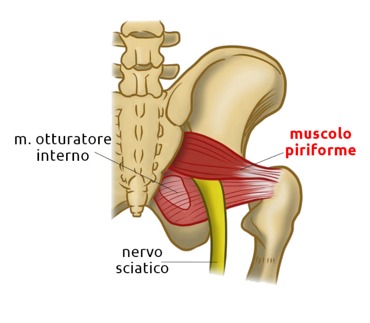 - Descrizione: Compressione del nervo sciatico da parte del muscolo piriforme, situato nella parte posteriore del Bacino, causando dolore alle natiche e occasionalmente Sciatica. Durante la corsa o la stazione seduta, questo muscolo può comprimere il nervo sciatico nel punto in cui emerge da sotto il muscolo piriforme per passare al di sopra dei muscoli rotatori dell'Anca. I sintomi sono: