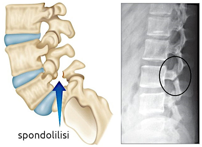 - Descrizione: Alterazione vertebrale in cui c'è una interruzione dell’arco posteriore delle Vertebre lombari, che si trova tra le apofisi articolari superiori e inferiori. Si presenta nella parte più bassa della colonna lombare, ma si può presentare anche in altre vertebre, come nelle Vertebre dorsali. Risulta asintomatica nella maggior parte dei casi, ma può evolversi in Spondilolistesi. Riguarda V e IV vertebra lombare. Le complicanze possono essere: