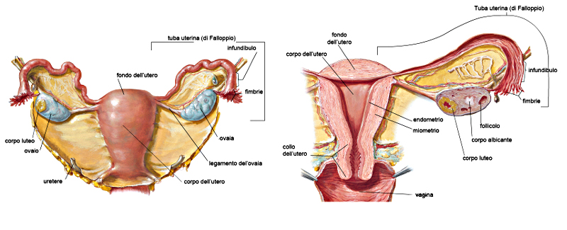 - Descrizione: L'utero è un Organo femminile parzialmente extraperitoneale, a forma triangolare il cui vertice si affaccia alla Vagina. Si colloca nel piccolo bacino tra la Vescica urinaria ed il Retto. Si riconosce in esso un fondo, un corpo ed un collo. All'apice del collo si trova l'orifizio uterino. Al fondo uterino giungono le Tube di Fallopio che catturano l'ovulo espulso dall'ovaio e lo convogliano fino alla cavità uterina.